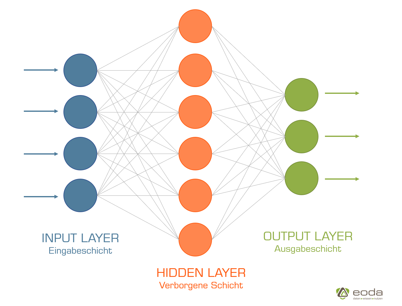 Wie können nun künstliche, neuronale Netze selbst denken lernen? Ohne Starthilfe funktioniert es nicht ganz – der Algorithmus muss erst einmal mit seinem Treibstoff gefüttert werden: Trainingsdaten. Diese Daten weisen für den Menschen sichtbare Variablen auf und kommen als Input in die erste Schicht des Netzwerks. Aus dieser Vielzahl von Informationen werden wiederkehrende Strukturen in den sogenannten verborgenen Schichten erkannt, evaluiert verknüpft. So werden Bilder, Texte und akustische Daten anhand von mehreren Schichten ausgewertet, die alle miteinander vernetzt sind. In diesem Prozess kann auch eine selbstständige Verbesserung erfolgen, denn die Entwicklung ergibt sich aus der Verknüpfungsgewichtung der verborgenen Schichten. So können eigene Entscheidungen und Prognosen getroffen werden, ohne dass der Mensch selbst in den Prozess eingreift. Die Genauigkeit dieses Verfahrens basiert auf einer großen Menge vorklassifizierter Daten.