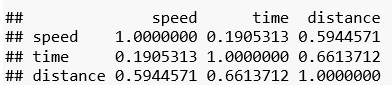 go_track_tracks_analyse < - go_track_tracks %>% select(speed, time, distance) cor(go_track_tracks_analyse)