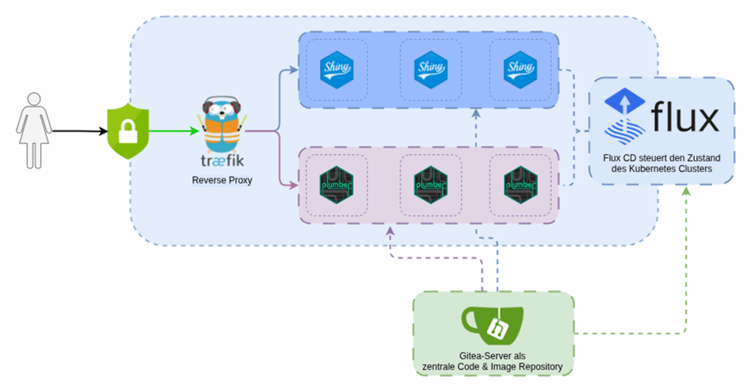 Die Shiny-Anwendungen werden nach jedem Commit automatisch auf der Kubernetes-Infrastruktur bereitgestellt. Dies beschleunigt die Release-Zyklen und reduziert manuelle Aufwände.