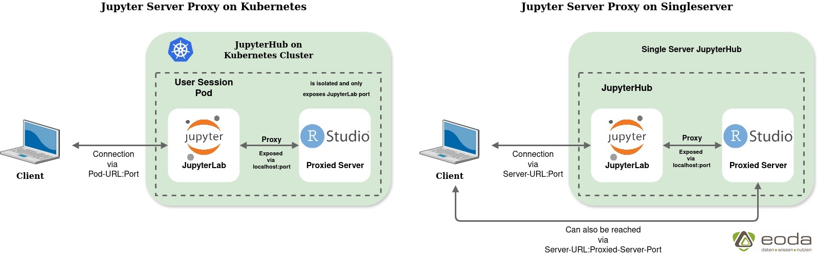 In a Kubernetes-based JupyterHub, however, this risk does not exist: all traffic is routed through the individual user session pod and its exposed ports. The pod only opens the ports required by JupyterLab and also handles user authentication. All integrated servers run entirely inside the pod, preventing access by other users. The following graphic illustrates the network connections: