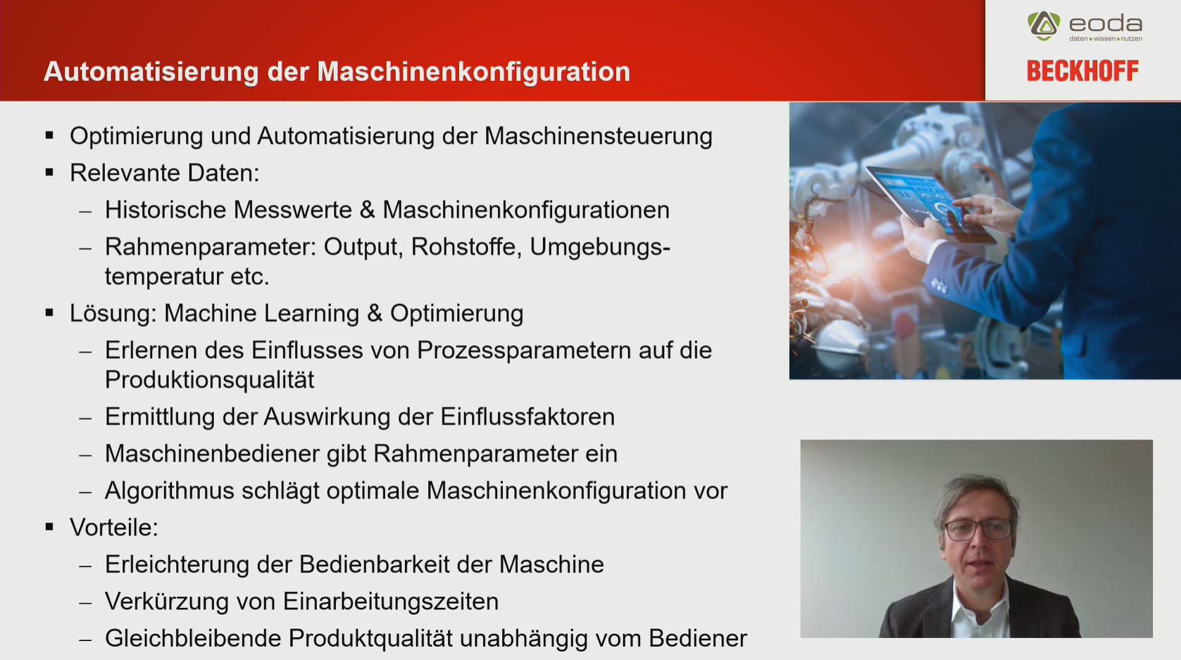 Mit knapp 100 Teilnehmerinnen und Teilnehmern war die Veranstaltung von Beckhoff zum Thema „Maschinelles Lernen in der Automation“ ein voller Erfolg. Während des zweitätigen Webinars erhielten die Teilnehmer von Dr. Fabian Bause, Produktmanager TwinCAT von Beckhoff, und Oliver Bracht, Chief Data Scientist und Geschäftsführer von eoda, Einblicke in datenbasierte Lösungswege.