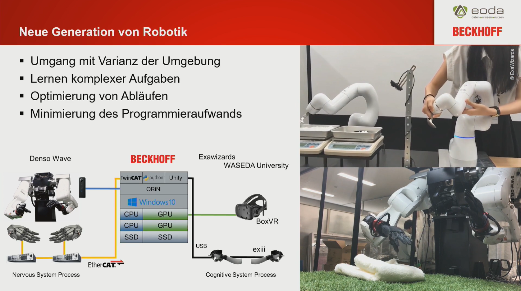 Hierbei „imitieren“ Roboter das menschliche Lernen. Beim gezeigten Beispiel wurden Roboter mithilfe von Beckhoff’s TwinCAT angelernt. Dabei wurde gezeigt, wie Roboter z.B. per Virtual Reality oder manuell, bestimmte Abläufe übernehmen, indem sie die Bewegungen nachempfinden, die der Mensch durchführt. Diese Bewegungen können dann von Algorithmen analysiert und entsprechend angepasst werden.